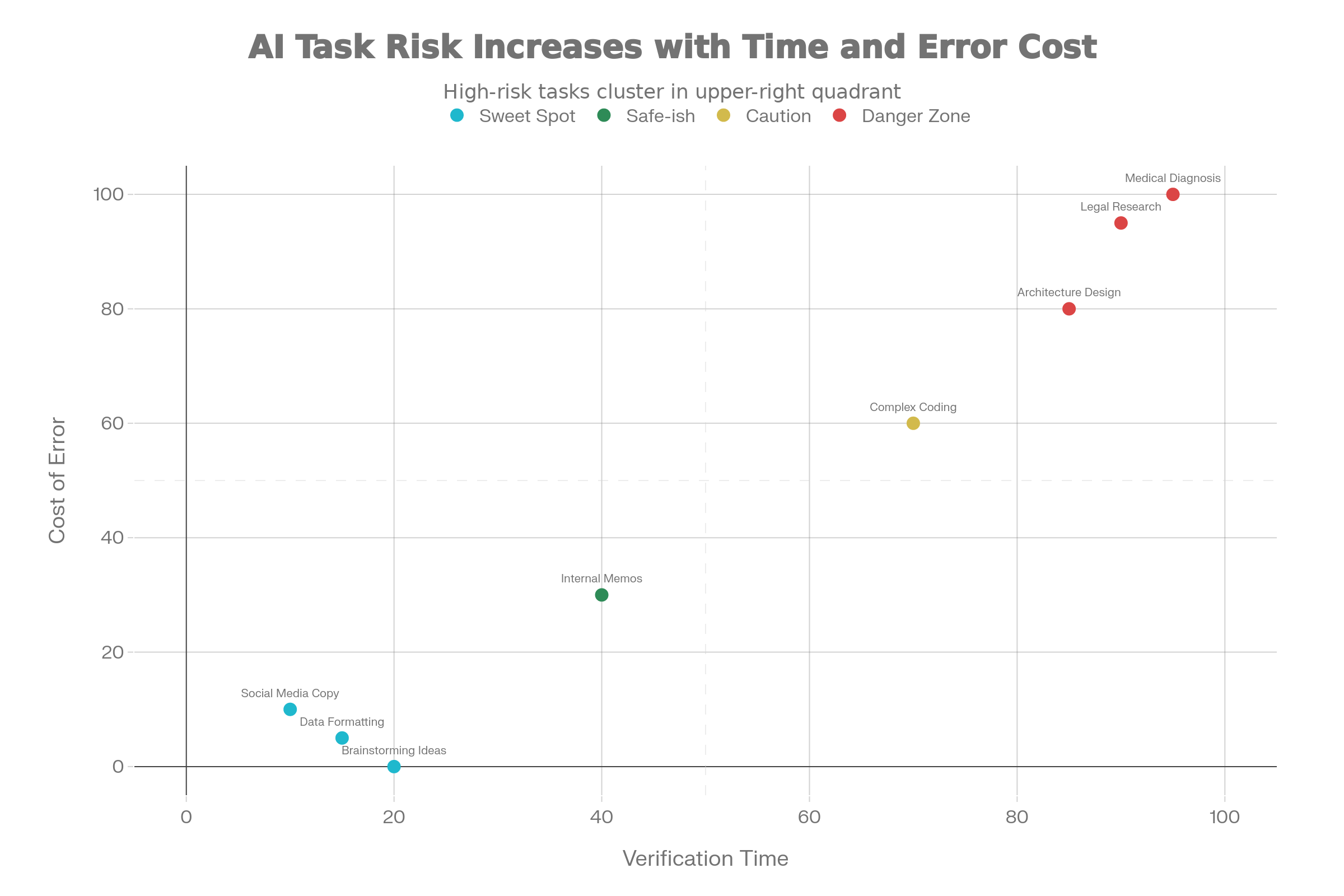 The AI Delegation Matrix helps identify which tasks are safe for AI. Tasks in the bottom-left (Low Risk, Fast Verify) are the ‘Sweet Spot’. Tasks in the top-right (High Risk, Slow Verify) are the ‘Danger Zone’ where manual work is preferred.
